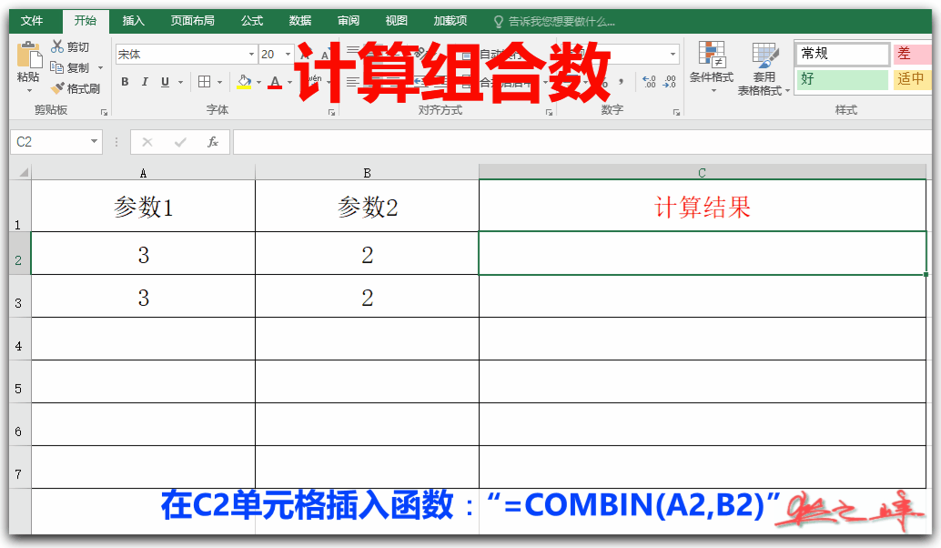 1)在C2单元格插入函数:“=COMBIN(A2,B2)”,按【Enter】键确认;