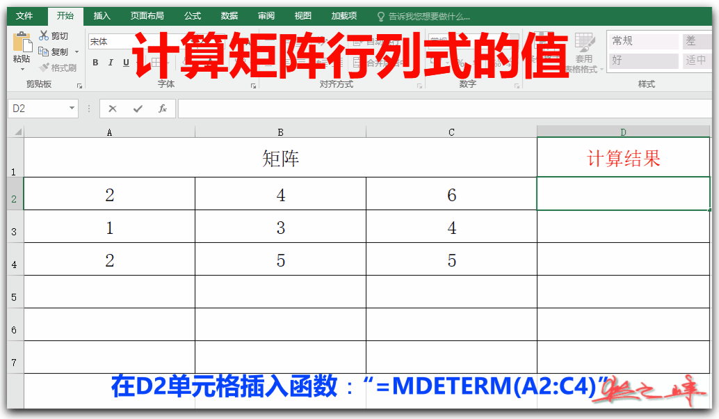 在D2单元格插入函数:“=MDETERM(A2:C4)”,按【Enter】键确认。