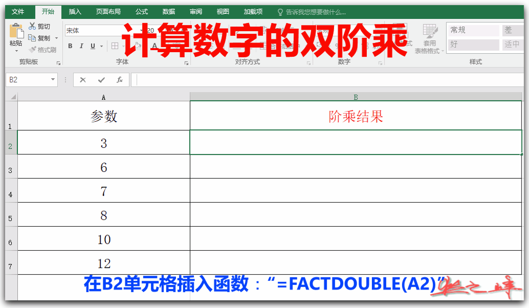 1)在B2单元格插入函数:“=FACTDOUBLE(A2)”,按【Enter】键确认;