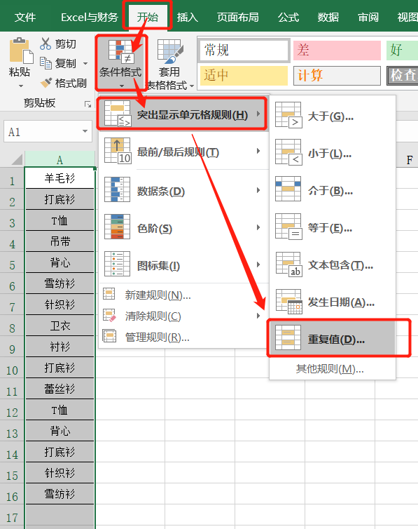 同样,选中A列,点击【开始】选项卡中的【条件格式】按钮,选择【突出显示单元格规则】-【重复值】,这一步操作都一样。