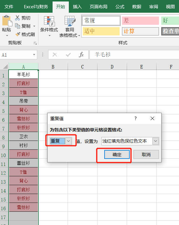 在重复值窗口中,点击【确定】按钮,即可把重复数据填充颜色显示出来。