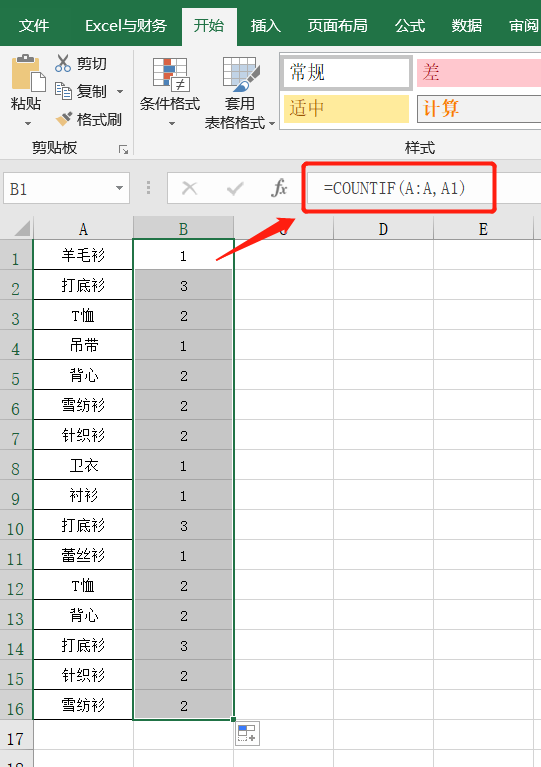 确认公式后,再双击或下拉填充公式即可得出对应的数据出现的次数。