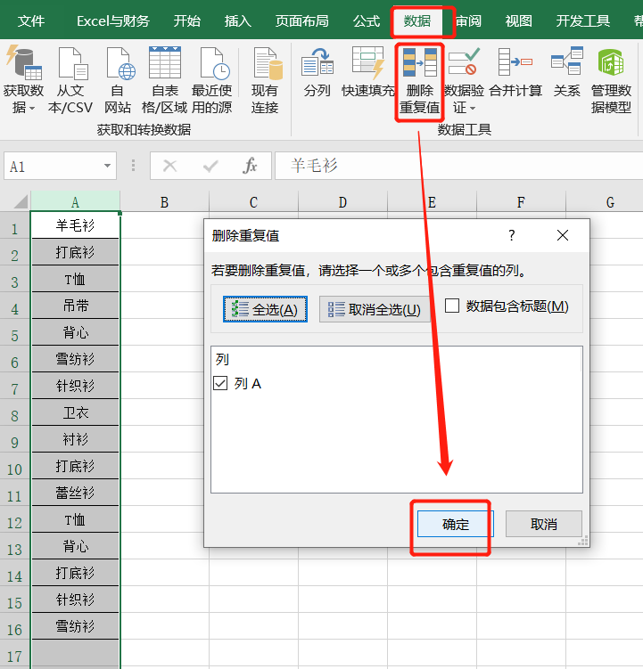 选中A列,点击【数据】选项卡中的【删除重复值】按钮,然后在新窗口中直接点击【确定】,重复值就被删除了。