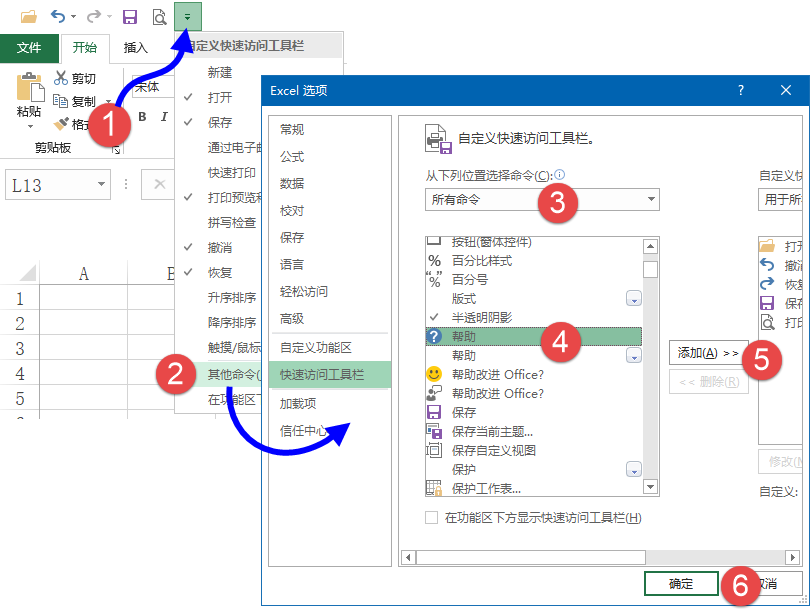 在顶部选择【所有命令】,然后在命令列表中选择“帮助”,再单击【添加】按钮,最后单击【确定】按钮。