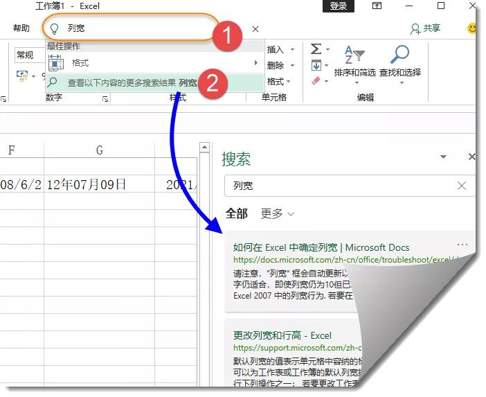 在功能区的右侧有一个搜索框,直接在搜索框中输入要查询的东西,比如“列宽”,下拉列表会显示“列宽”的帮助入口。