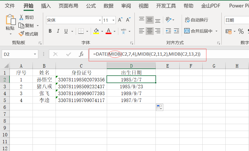 我们只需要将出生日期提取出来,因为出生日期中包括年月日,所以我们这里将使用DATE函数和MID函数的嵌套,DATE函数的主要是为我们所提取出来的数字加上年月日。