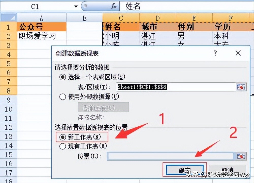弹出窗口,选择“新工作表”,其它保持默认,点击“确定”。