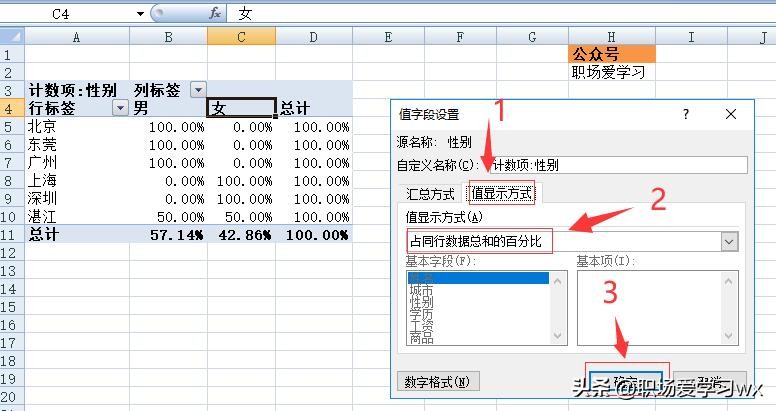 鼠标左键,点击“数值”右边的三角形符号,点击“值字段设置”。弹出窗口,点击“值显示方式”,选择“占同行数据总和的百分比”,点击“确定”。