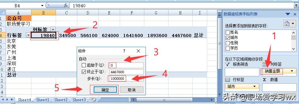 把“销售金额”拖到“列标签”下面的空白区域,找到需要分组的列,鼠标左键,点击表格“列标签”下面的第一个单元格,点击鼠标右键,点击“组合”。弹出窗口,“起始于”改成“0”,“步长”改成“1000000”,点击“确定”。数字分组就搞好了。