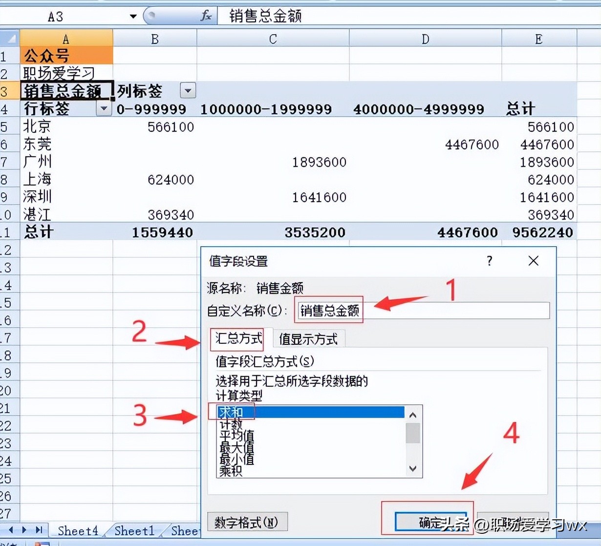 把“销售金额”拖到“数值”下面的空白区域,鼠标左键,点击“数值”右边的三角形符号,点击“值字段设置”。弹出窗口,“自定义名称”改成“销售总金额”,点击“汇总方式”,选择“求和”,点击“确定”。