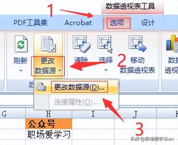 点击顶部的“选项”菜单,点击“更改数据源”右下角的三角形符号,点击“更改数据源”。