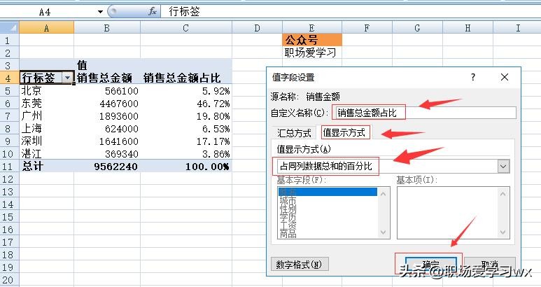 第二次,把“销售金额”拖到“数值”下面的空白区域。鼠标左键,点击“数值”右边的三角形符号,点击“值字段设置”。弹出窗口,“自定义名称”改成“销售总金额占比”,点击“汇总方式”,选择“求和”。点击“值显示方式”,选择“占同列数据总和的百分比”,点击“确定”。