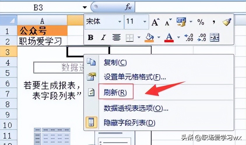 鼠标左键,点击数据透视表的任意一个单元格。点击鼠标右键,点击“刷新”。