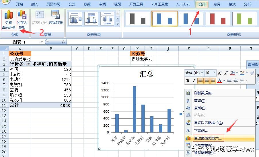 (2)鼠标左键点击数据透视图,点击顶部的“设计”菜单,点击左上角的“更改图表类型”。