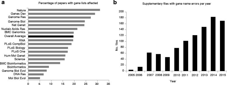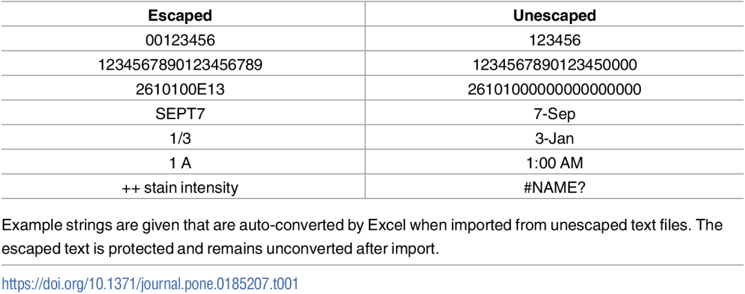 2016年Genome biology对2005-2015期间发表在18个杂志的文章附表中基因名字做了分析,发现Nature中有附表的文章里面,有30%以上出现了EXCEL引起的基因名字转换错误,受影响的文章有74篇,影响的基因1375个。