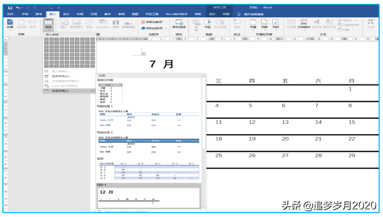 三是:单击"插入"——在"表格"选项组中——单击"表格"下的小箭头——选择"快速表格"选项——在弹出的列表中——选择"日历",如图。