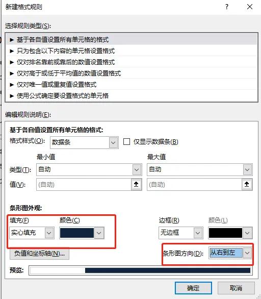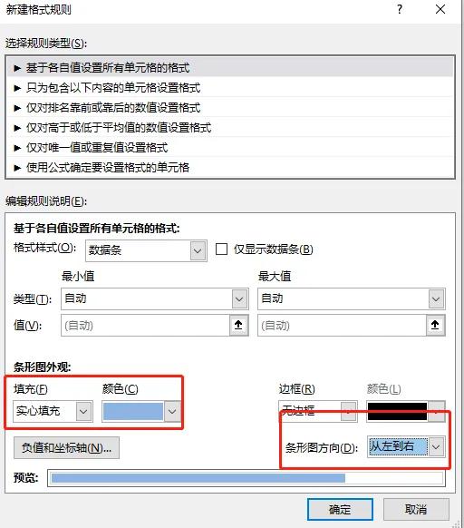 首先选择左边一列的数据,点击菜单栏开始按钮—条件格式—数据条—其他规则。弹出新建格式规则的对话框,在条形图外观这里选择我们需要的颜色,将条形图的方向设置为从右到左,点击确定。那么左边一列数据的条件格式就设置好了。