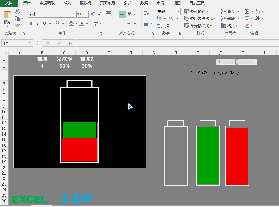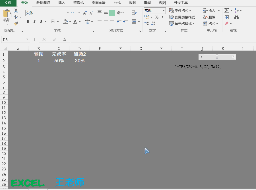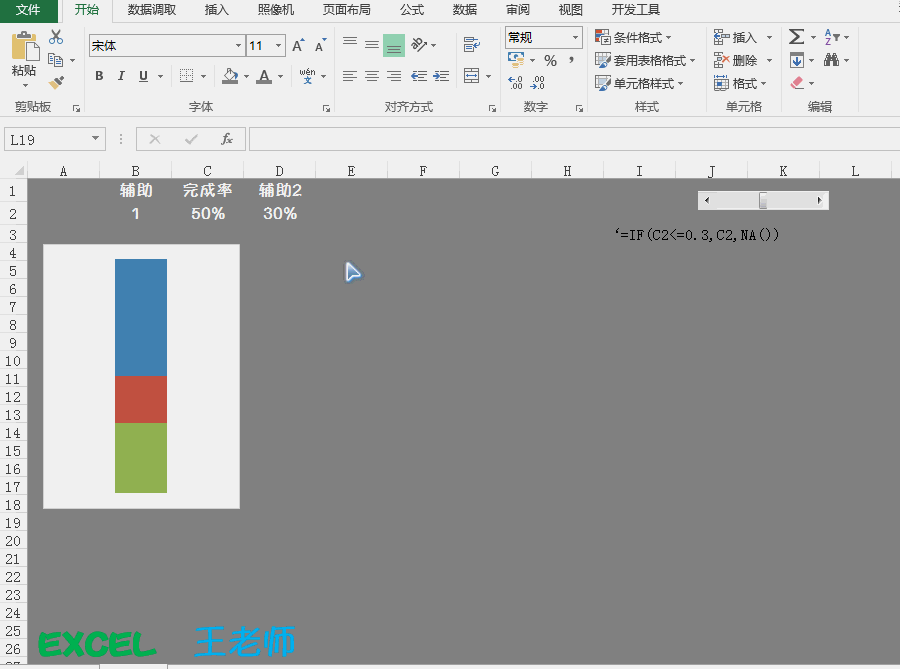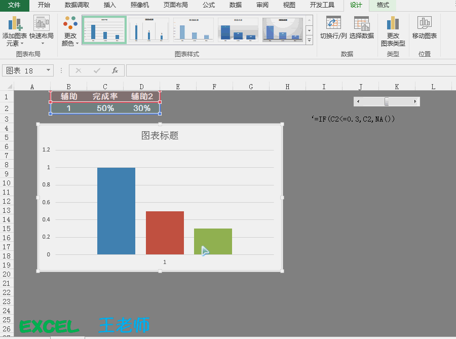Step6:在辅助2的数据单元个中(E2单元个)输入如下公式:=IF($C$2<=0.3,$C$2,NA())。如下动图所示: