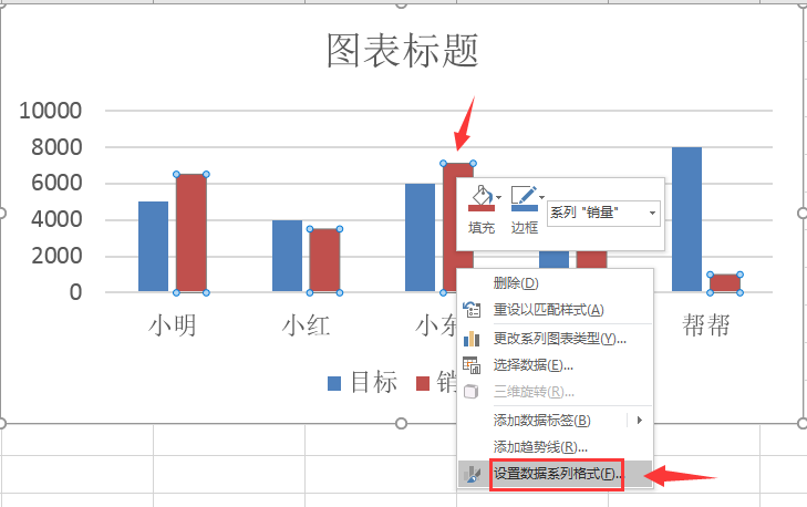 点击图表内销量的柱形图标,使其全部选中红色柱形区域,右键设置数据系列格式。