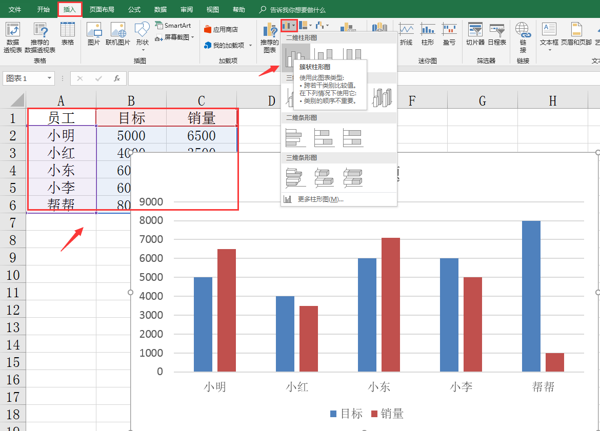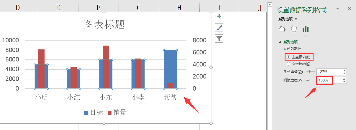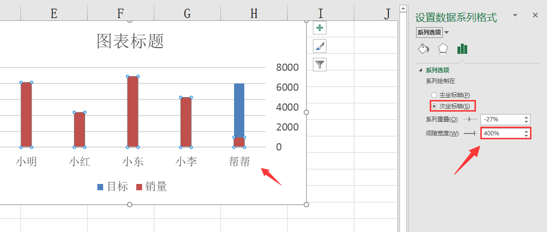 大家请看范例图片,如何设置左边的温度计柱形图,明确显示目标与销量的关系。