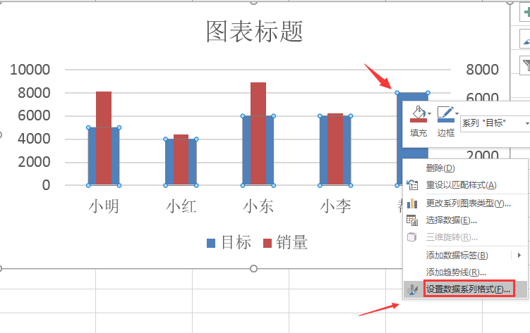 同样的方法选中蓝色柱形图标,右键设置数据系列格式。