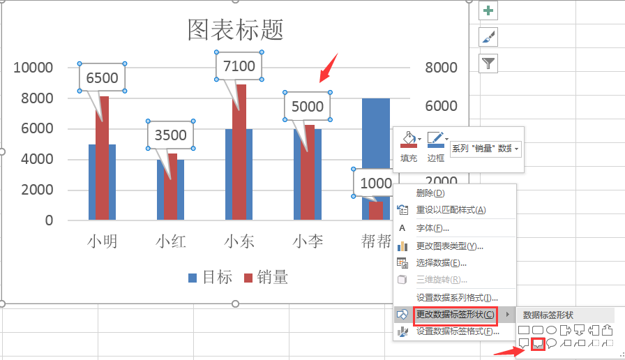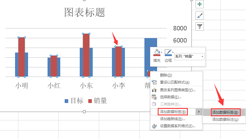 为了让实际销量更加明确,点击红色柱形——添加数据标签。