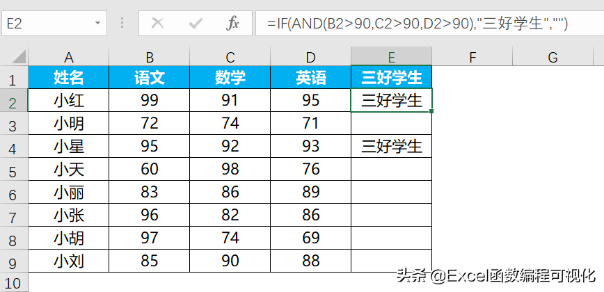 在单元格内输入:” =IF(AND(B2>90,C2>90,D2>90),"三好学生","")”,这里将if函数的第一个参数判断条件用and函数替代,同时满足三个条件,返回”三好学生”,否则返回空值。