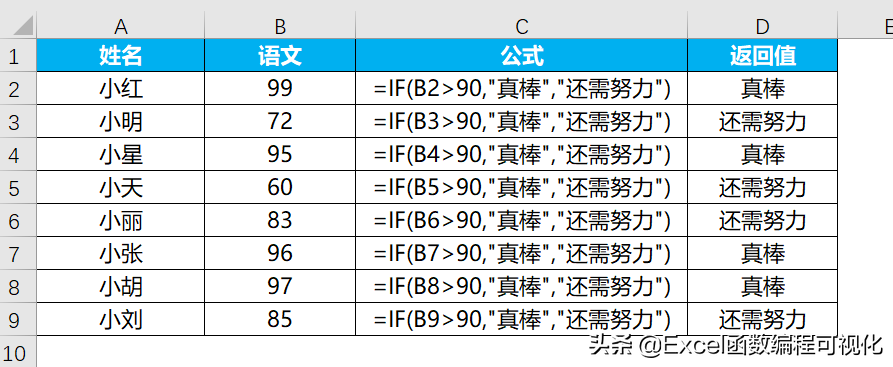 成绩90分以上,返回”真棒”,否者返回”还需努力”。