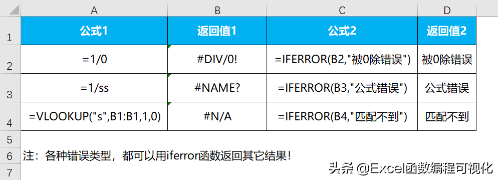 可以发现,不管是被零除错误、无效名称错误还是值不可用错误,都可以用iferror函数返回其它结果,保证数据的观赏性。