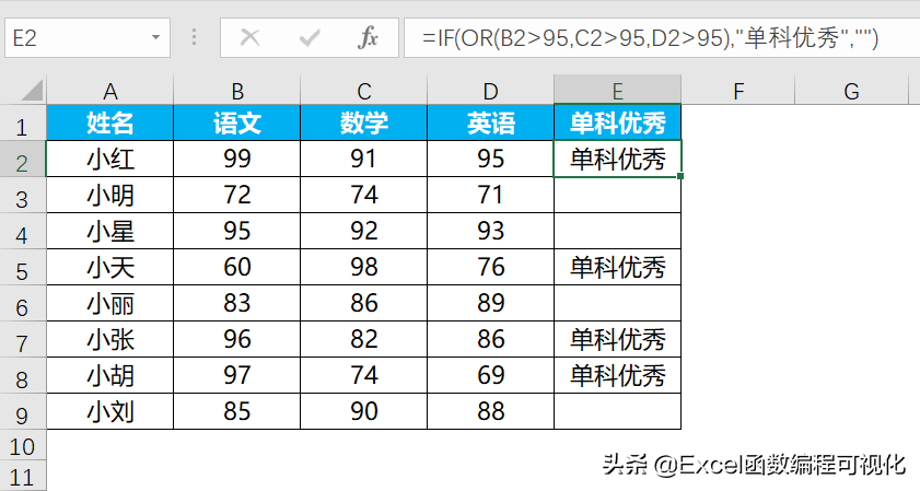 下图中,三科成绩有有一科成绩大于95分,即返回”单科优秀”,否则返回空值,在单元格内输入:” =IF(OR(B2>95,C2>95,D2>95),"单科优秀","")”