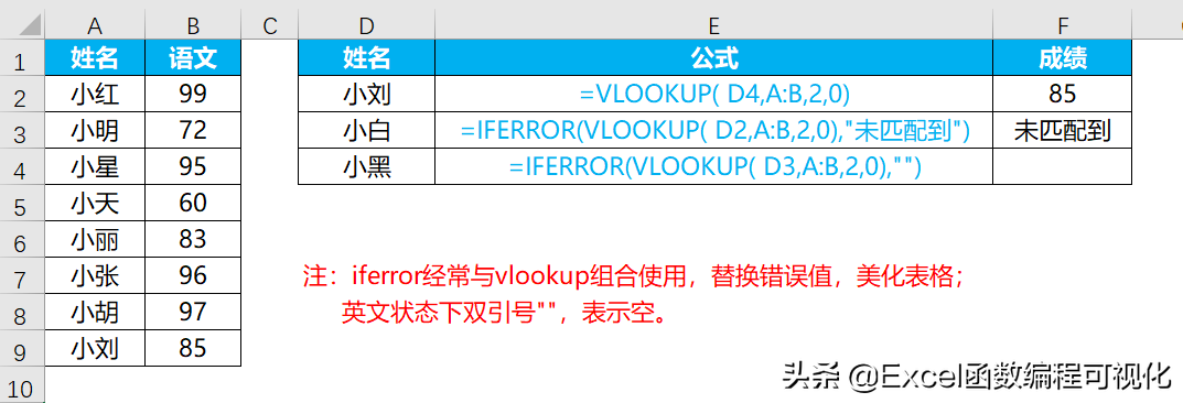 Iferror最经常与vlookup函数组合使用,大家都知道vlookup函数匹配不到内容,会返回错误值#N/A,#N/A影响表格美观,我们可以使用iferror函数将错误值替换成其它内容;