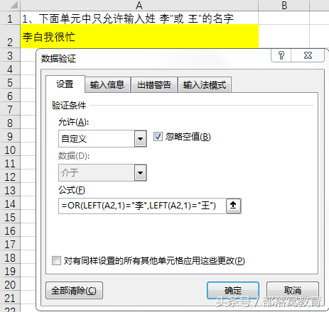 以下案例是说单元格内只允许输入“李”开头或“王”开头的数据,问你怎么办?