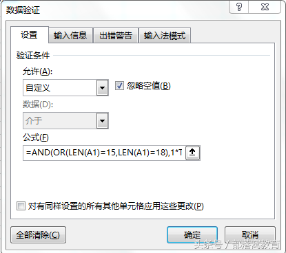 在这里我们用OR(LEN(A1)=15,LEN(A1)=18),意思是要输入的数字必须满足15位或18位都可以,这个没问题吧?