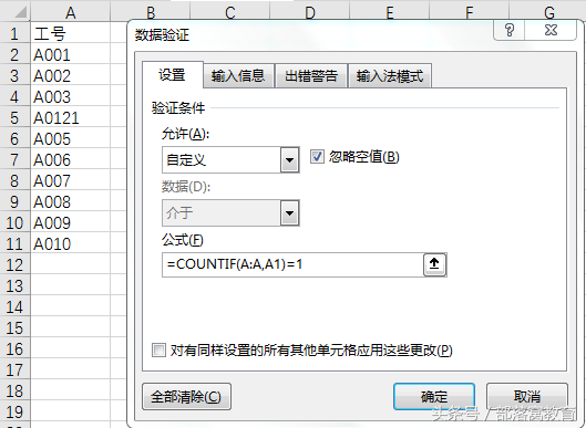 步骤:先选中A列,然后点击数据->数据验证(2013版之前的叫作数据有效性),然后在自定义输入框中输入=Countif(A:A,A1)=1,意思是判断A列中A1的个数是否为1,我们只允许出现1个。