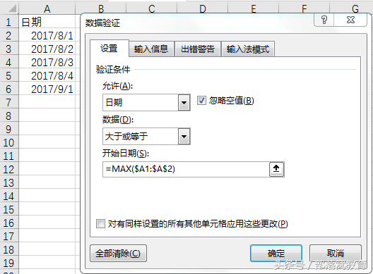 步骤:先选中A列,然后点击数据->数据验证(2013版之前的叫作数据有效性),然后在允许中选择“日期”,然后数据中选择“大于或等于”,输入框中输入=max($A1:A$2)。然后按确定,这样A列中输入的日期必须大于或等于已有的日期才能通过。