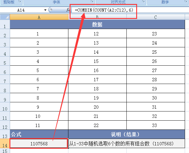 图例1:从1-33中随机选取6个数的所有组合数 ,函数返回1107568
