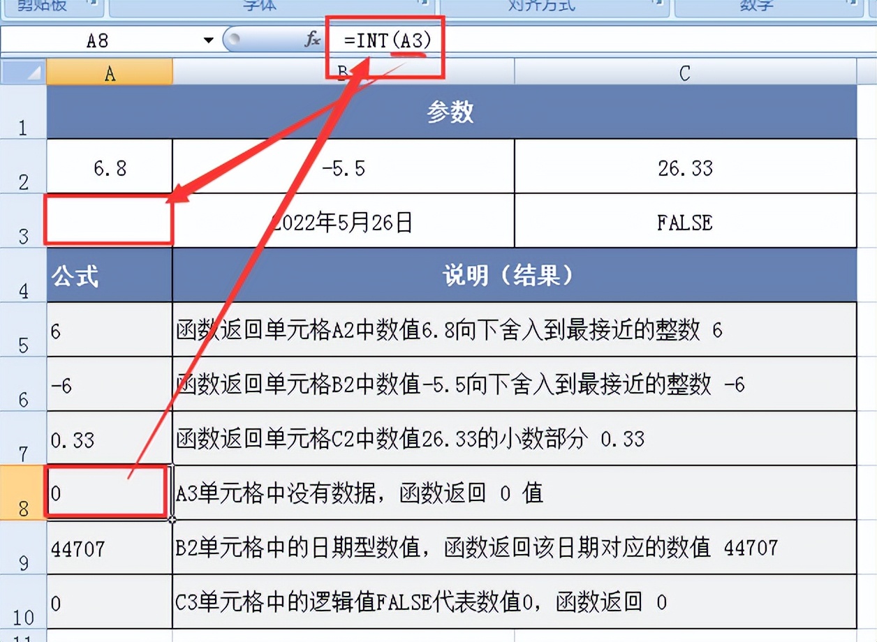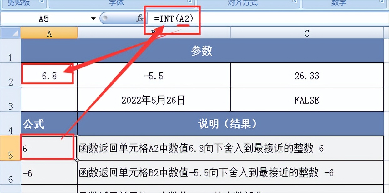 图例1:函数返回单元格A2中数值6.8向下舍入到最接近的整数 6