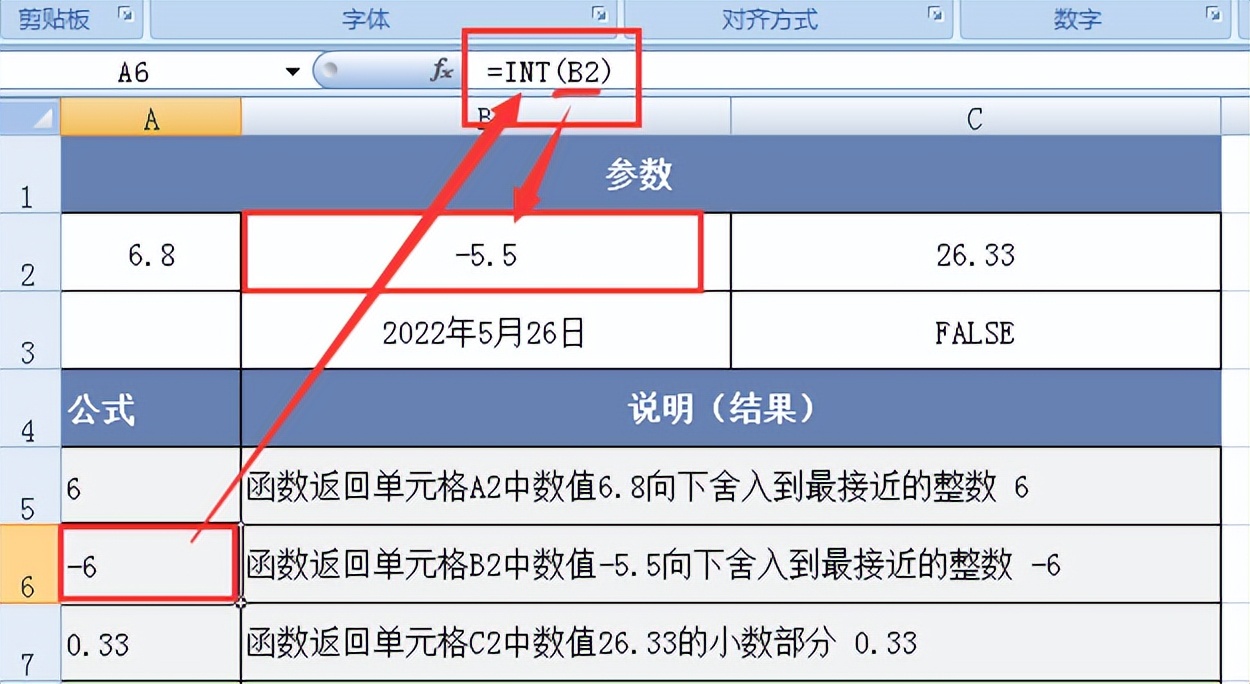 图例2:函数返回单元格B2中数值-5.5向下舍入到最接近的整数 -6