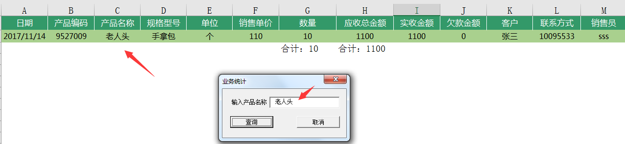 销售统计表中输入产品名称即可查出该该产品所有的销售明细,并且自动计算数量金额。