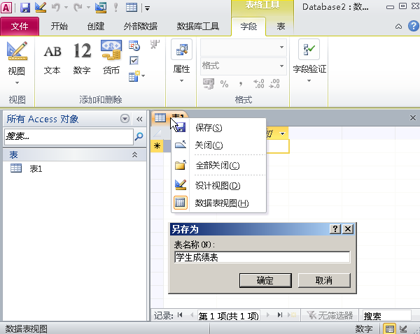 选择“表”后,出现了表1,这个就是我们创建的表了,但它是一个空的表: