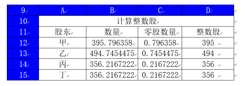 (1)先计算甲乙丙丁四名投资者的整数股,具体公式如下: