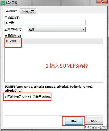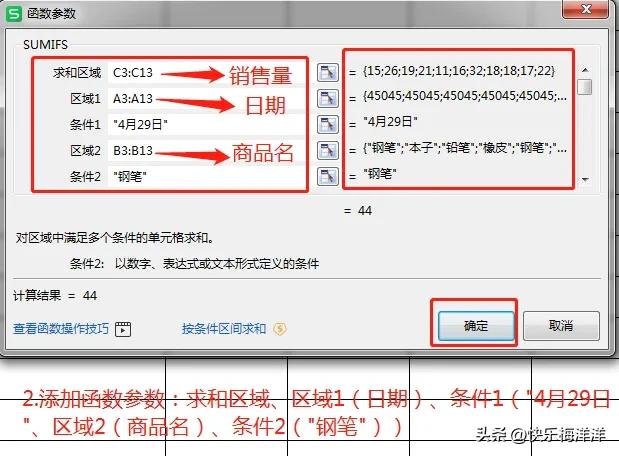 2、添加函数参数:求和区域、区域1、条件1、区域2、条件2