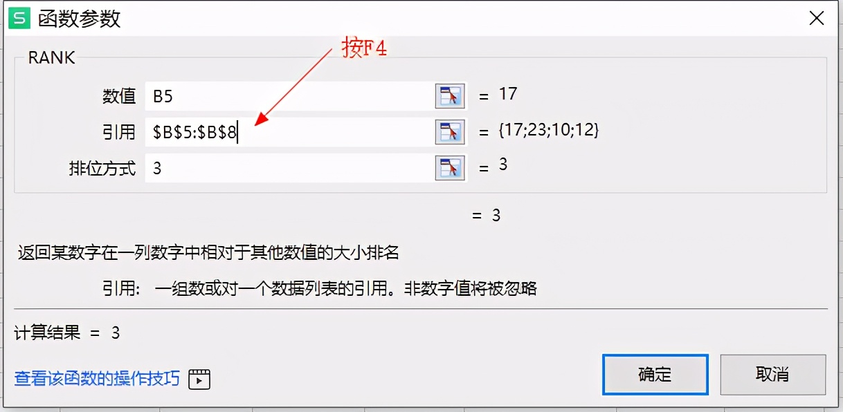 为保证排序的范围不变,此处需要把范围变为绝对引用。点击F4添加绝对引用