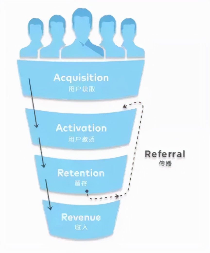 “AARRR”转化漏洞模型,常被用作用户增长和运营的分析和方法。“AARRR”这5个字母,分别对应用户生命周期中的5个重要环节。即Acquisition(获取用户)、Activation(激发活跃)、Retention(提高留存)、Revenue(增加收入)、Referral(传播推荐)。