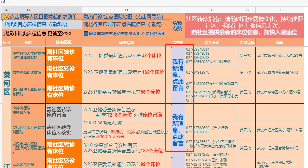 盒饭君至今都收藏着一份,在新冠疫情期间由志愿者组织bridge床位组整理的《武汉市定点医院床位医疗信息合集》的在线文档。