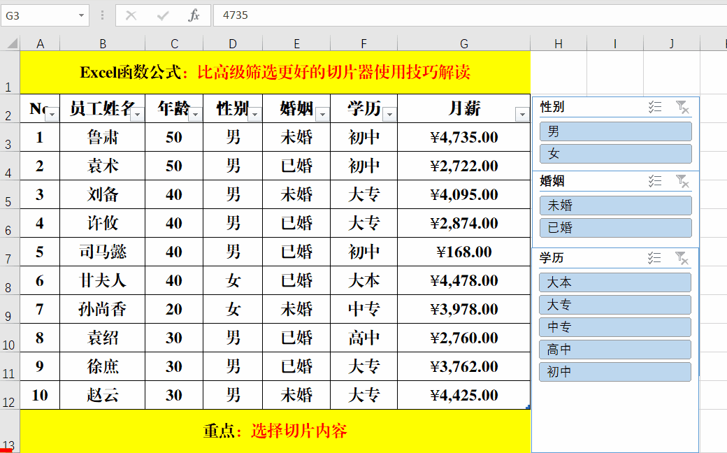 插入切片器,依次单击切片器切片器中的“男”、“未婚”、大专”即可。
