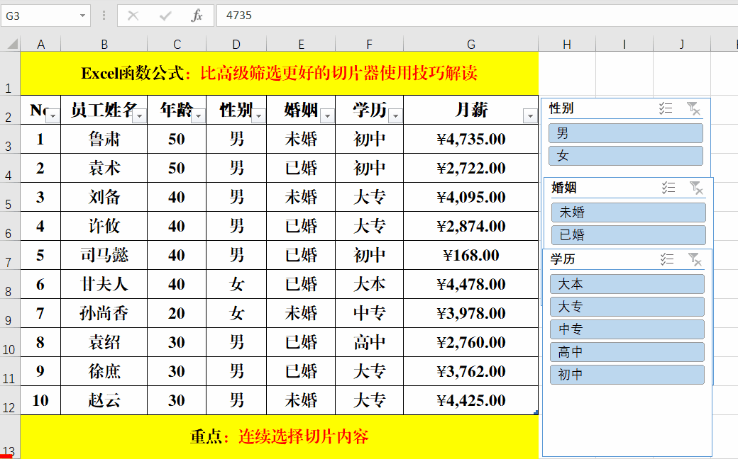 目的2:多条件筛选——筛选“男”性同志中“未婚”,且学历为“大专”的人员信息。