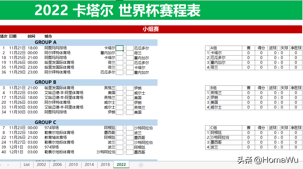 整理了多年前的数据表,添加了2022世界杯的对阵信息。原来还要2支队伍没有确定,附加赛也没完呢。