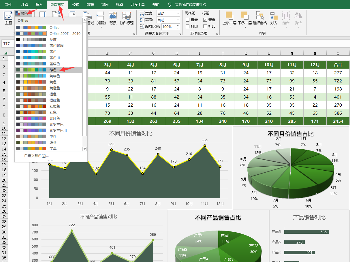 メ进入Excel页面布局——颜色,多款自定义颜色随意选择,图表批量变色,完美应用。メ