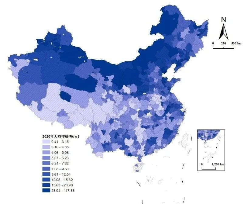 数据字段包括城市名称、所在省份、农业、服务业、工业能源、工业过程、工业、城镇生活、农村生活、生活、道路、铁路、水运、航空、交通、能源、间接排放、直接排放、总排放、非化石能源占比、人均排放、单位总GDP二氧化碳排放。我们以2020年人均排放为例进来预览一下: